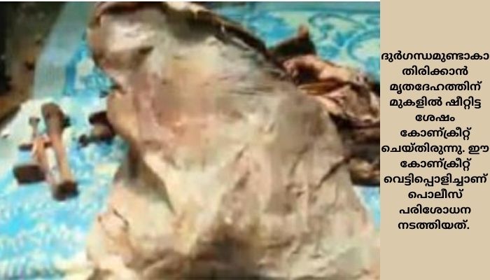 ദുര്ഗന്ധമുണ്ടാകാതിരിക്കാന് മൃതദേഹത്തിന് മുകളില് ഷീറ്റിട്ട ശേഷം കോണ്ക്രീറ്റ് ചെയ്തിരുന്നു. ഈ കോണ്ക്രീറ്റ് വെട്ടിപ്പൊളിച്ചാണ് പൊലീസ് പരിശോധന നടത്തിയത്. പരിശോധനയില് എല്ലിന് കഷണങ്ങള് പൊലീസിന് ലഭിച്ചു. കൂടാതെ അവശിഷ്ടത്തിനൊപ്പം ചെരുപ്പും കുരിശും കിട്ടിയിട്ടുണ്ട്.