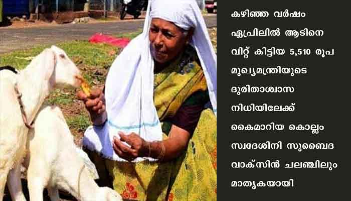 തിരുവനന്തപുരം: കഴിഞ്ഞ വര്‍ഷം ഏപ്രിലില്‍ ആടിനെ വിറ്റ് കിട്ടിയ 5,510 രൂപ മുഖ്യമന്ത്രിയുടെ ദുരിതാശ്വാസ നിധിയിലേക്ക് കൈമാറിയ കൊല്ലം സ്വദേശിനി സുബൈദ വാക്സിൻ ചലഞ്ചിലും മാതൃകയായി. തന്റെ ആടുകളെ വിറ്റ പണം സുബൈദ വാക്സിന്‍ വിതരണത്തിനായി സംഭാവന നല്‍കിയെന്ന് വെളളിയാഴ്ച(23/04/21) വാർത്താ സമ്മേളനത്തിടെ മുഖ്യമന്ത്രി പിണറായി വിജയനാണ് അറിയിച്ചത്. 5510 രൂപയാണ് മുഖ്യമന്ത്രിയുടെ ദുരിതാശ്വാസ നിധിയിലേക്ക് നല്‍കാന്‍ സുബൈദ ജില്ലാ കലക്ടര്‍ക്ക് കൈമാറിയത്.