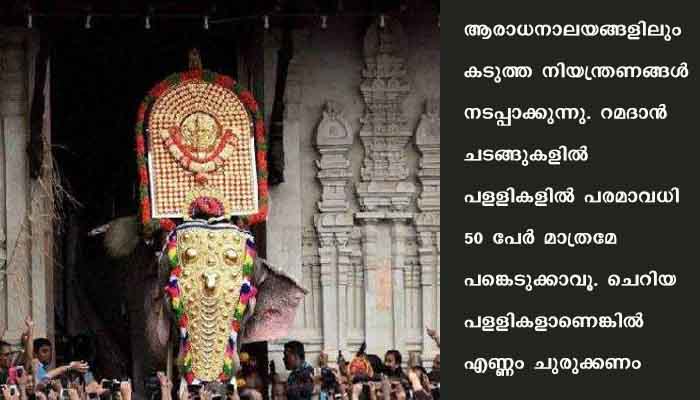 ആരാധനാലയങ്ങളിലും കടുത്ത നിയന്ത്രണങ്ങള്‍ നടപ്പാക്കുന്നു. റമദാന്‍ ചടങ്ങുകളില്‍ പളളികളില്‍ പരമാവധി 50 പേര്‍ മാത്രമേ പങ്കെടുക്കാവൂ. ചെറിയ പളളികളാണെങ്കില്‍ എണ്ണം ചുരുക്കണം. നമസ്‌കരിക്കാന്‍ പോകുന്നവര്‍ പായ സ്വന്തമായി കൊണ്ടുപോകണം. ദേഹശുദ്ധിവരുത്താന്‍ ടാങ്കിലെ വെളളം ഉപയോഗിക്കരുത്‌. പകരം പൈപ്പ്‌ വെളളം ഉപയോഗിക്കണം. ആരാധനാലയങ്ങളില്‍ ഭക്ഷണവും തീര്‍ത്ഥവും നല്‍കുന്നത്‌ ഒഴിവാക്കണം.