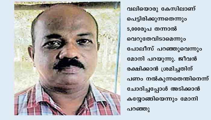 സ്ഥലത്തെത്തിയ പോലീസ് താന് പറഞ്ഞതൊന്നും വിശ്വസിക്കാന് തയ്യാറായില്ലെന്ന് മോനി പറഞ്ഞു. പോലീസ് പരുഷമായി സംസാരിക്കുകയും സ്റ്റേഷനിലേക്ക് കൊണ്ടുപോവുകയും ചെയ്തു. മൊബൈല് ഫോണും വാച്ചും മോതിരവും പിടിച്ചുവാങ്ങി. വലിയൊരു കേസിലാണ് പെട്ടിരിക്കുന്നതെന്നും 5,000രൂപ തന്നാല് വെറുതേവിടാമെന്നും പോലീസ് പറഞ്ഞുവെന്നും മോനി പറയുന്നു. ജീവന് രക്ഷിക്കാന് ശ്രമിച്ചതിന് പണം നല്കുന്നതെന്തിനെന്ന് ചോദിച്ചപ്പോള് അടിക്കാന് കയ്യോങ്ങിയെന്നും മോനി പറഞ്ഞു.മനപൂര്വമല്ലാത്ത നരഹത്യാകേസ് മോനിയുടെ പേരില് ചുമത്തി . അലക്ഷ്യമായി കാറോടിച്ച് കാല്നടക്കാരനെ ഇടിച്ചുകൊന്നുവെന്നായിരുന്നു ആരോപണം. കൃത്രിമ തെളിവുകളും മരിച്ചയാളിന്റെ സഹോദരനെ സാക്ഷിയെന്ന നിലയിലും പോലീസ് അവതരിപ്പിച്ചു.