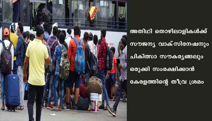 കണ്ണൂര്‍: അതിഥി തൊഴിലാളികള്‍ക്ക്‌ സൗജന്യ വാക്‌സിനേഷനും ചികിത്സാ സൗകര്യങ്ങലും ഒരുക്കി സംരക്ഷിക്കാന്‍ കേരളത്തിന്റെ തീവ്ര ശ്രമം. കോവിഡ്‌ വ്യാപനം തടയുന്നതിന്റെ ഭാഗമായിട്ടാണെങ്കിലും കഴിഞ്ഞ ലോക്‌ഡൗണ്‍ കാലത്ത്‌ കേരളം വിട്ടവരില്‍ മഹാഭൂരിപക്ഷം പേരും തിരിട്ടുവന്നിട്ടില്ല. ഇത്‌ നിര്‍മ്മാണം അടക്കം പലമേഖലകളേയും ബാധിക്കുമെന്നതാനാലാണ്‌ ഈ നീക്കം. എല്ലാ ജില്ലകളിലും ഭാഷ അറിയാവുന്നവരെ നിയോഗിച്ച് കോള്‍ സെന‍്ററുകള്‍ തുടങ്ങിയിട്ടുണ്ട്‌. തൊഴിലാളികള്‍ക്ക്‌ രോഗം വന്നാല്‍ ആശുപത്രി ആംബുലന്‍സ്‌ സേവനങ്ങള്‍ ഉറപ്പുവരുത്താന്‍ ജില്ലാ ലേബര്‍ ഓഫീസര്‍മാര്‍ക്ക്‌ നിര്‍ദ്ദേശം നല്‍കിയിട്ടുണ്ട്‌. വിവിധ ഭാഷകളില്‍ കോവിഡ്‌ ബോധവല്‍ക്കരണ ലഘുലേഖകളും തയ്യാറാക്കുന്നുണ്ട്‌.