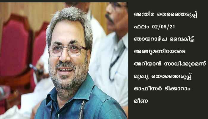 തിരുവനന്തപുരം: അന്തിമ തെരഞ്ഞെടുപ്പ് ഫലം 02/05/21 ഞായറാഴ്ച വൈകിട്ട് അഞ്ചുമണിയോടെ അറിയാന്‍ സാധിക്കുമെന്ന് മുഖ്യ തെരഞ്ഞെടുപ്പ് ഓഫീസര്‍ ടിക്കാറാം മീണ. രാത്രിയോടെയായിരിക്കും ഔദ്യോഗികപ്രഖ്യാപനമുണ്ടാകൂയെന്നും മീണ റിപ്പോര്‍ട്ടര്‍ ടിവി എഡിറ്റേഴ്‌സ് അവറില്‍ പറഞ്ഞു. മാധ്യമങ്ങള്‍ക്ക് വിവരങ്ങള്‍ ലഭിക്കാന്‍ കാലതാമസവും ഉണ്ടാവില്ലെന്നും തെരഞ്ഞെടുപ്പ് കമീഷന്റെ വെബ്‌സൈറ്റിലൂടെ വിവരങ്ങള്‍ ലഭ്യമാകുമെന്നും ടിക്കാറാം മീണ അറിയിച്ചു.