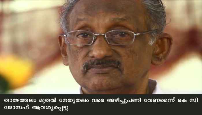 കോണ്ഗ്രസില് നേതൃമാറ്റം ആവശ്യപ്പെട്ട് മുതിര്ന്ന നേതാവും മുന്മന്ത്രിയുമായ കെ സി ജോസഫ്. താഴേത്തലം മുതല് നേതൃതലം വരെ അഴിച്ചുപണി വേണമെന്ന് കെ സി ജോസഫ് ആവശ്യപ്പെട്ടു. മാധ്യമങ്ങൾക്കു മുൻപാകെ 04/05/21 ചൊവ്വാഴ്ചയായിരുന്നു കെ സി ജോസഫിന്റെ തുറന്നുപറച്ചിൽ. കെപിസിസി അധ്യക്ഷനെയും രമേശ് ചെന്നിത്തലയെയും മാത്രം പഴി പറയുന്നില്ല. തദ്ദേശ തെരഞ്ഞെടുപ്പില് നിന്ന് കോണ്ഗ്രസ് പാഠം ഉള്ക്കൊണ്ടില്ല. പ്രതിപക്ഷ നേതാവ് ആരാകണമെന്നത് കൂടിയാലോചന നടത്തി തീരുമാനിക്കുമെന്നും കെ സി ജോസഫ് പറഞ്ഞു.