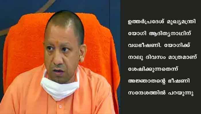 ലക്നൗ: ഉത്തർപ്രദേശ് മുഖ്യമന്ത്രി യോഗി ആദിത്യനാഥിന് വധഭീഷണി. യോഗിക്ക് നാലു ദിവസം മാത്രമാണ് ശേഷിക്കുന്നതെന്ന് അജ്ഞാതന്റെ ഭീഷണി സന്ദേശത്തിൽ പറയുന്നു. ഏപ്രിൽ 29ന് വൈകിട്ട് വാട്സ്ആപ് എമർജന്സി നമ്പറായ 112 ലാണ് യു.പി പൊലീസിന് ഭീഷണിസന്ദേശമെത്തിയത്. സംഭവത്തിൽ പൊലീസ് കേസ് രജിസ്റ്റർ ചെയ്തു.