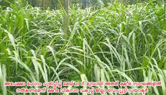 കോവിഡ് വ്യാപന പശ്ചാത്തലത്തില്‍ കൃഷി ചെയ്യാന്‍ താല്‍പര്യമുള്ളവരുടെ പേര്, വിലാസം, കൃഷി ചെയ്യുന്ന സ്ഥലത്തിന്റെ വിസ്തീര്‍ണ്ണം എന്നിവ ക്ഷീര സംഘങ്ങളില്‍ ഫോണ്‍ മുഖേന രജിസ്റ്റര്‍ ചെയ്യുകയും അപേക്ഷാ ഫോറം പൂരിപ്പിച്ച് മെയ് 20 ന് മുമ്പായി അതത് ക്ഷീര സംഘങ്ങളില്‍ നല്‍കണമെന്ന് ക്ഷീര വികസന വകുപ്പ് ജില്ലാ ഡെപ്യൂട്ടി ഡയറക്ടര്‍ അറിയിച്ചു. കൂടുതല്‍ വിവരങ്ങള്‍ക്ക് താഴെ പറയുന്ന ക്ഷീര വികസന ഓഫീസുമായി  ബന്ധപ്പെടുക. കല്‍പ്പറ്റ -04936 206770, മാനന്തവാടി-04935 244093, പനമരം -04935 220002, സുല്‍ത്താന്‍ ബത്തേരി -04936 222905.