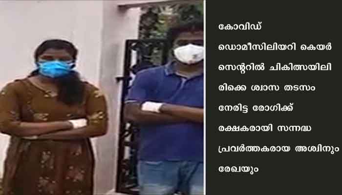 ആലപ്പുഴ: കോവിഡ് ഡൊമീസിലിയറി കെയര് സെന്ററില് ചികിത്സയിലിരിക്കെ ശ്വാസ തടസം നേരിട്ട രോഗിക്ക് രക്ഷകരായി സന്നദ്ധ പ്രവര്ത്തകരായ അശ്വിനും രേഖയും. ആലപ്പുഴ പുന്നപ്ര വടക്കുപഞ്ചായത്തിലെ കോവിഡ് ഡൊമീസിലിയറി കെയര് സെന്ററില് ഭക്ഷണം നല്കാന് എത്തിയപ്പോഴായിരുന്നു സംഭവം എന്ന് അശ്വിന് പറഞ്ഞു. ഇവര് ഭക്ഷണം നല്കിക്കൊണ്ടിരിക്കുന്നതിനിടയില് ഒരാള് പെട്ടെന്ന് തങ്ങള്ക്ക് സമീപത്തെത്തി മുകളിലത്തെ നിലയിലുളള ഒരു രോഗി ഗുരുതരാവസ്ഥയിലാണെന്നും ശ്വാസം കിട്ടാതെ പിടയുകയാണെന്നും പെട്ടെന്ന് എന്തെങ്കിലും ചെയ്യണമെന്നും പറഞ്ഞു.