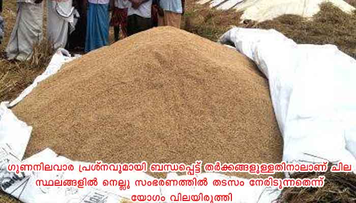 ജില്ലയിൽ 1.30 ലക്ഷം മെട്രിക് ടൺ നെല്ല് സംഭരിച്ചുകഴിഞ്ഞതായും ഇനി 4000 മെട്രിക് ടൺ നെല്ലാണ് വിവിധ പാടശേഖരങ്ങളിലായി സംഭരിക്കാനുള്ളതെന്നും പാഡി മാർക്കറ്റിങ് ഓഫീസർ മായ ഗോപാലകൃഷ്ണൻ യോഗത്തെ അറിയിച്ചു. 900 മെട്രിക് ടൺ നെല്ല് കൊയ്യാനുണ്ട്. പല സ്ഥലങ്ങളിലും തർക്കം പരിഹരിച്ച് നെല്ലെടുക്കാനുള്ള നടപടി തുടങ്ങിയതായും പാഡി മാർക്കറ്റിങ് ഓഫീസർ പറഞ്ഞു. ഗുണനിലവാര പ്രശ്‌നവുമായി ബന്ധപ്പെട്ട് തർക്കങ്ങളുള്ളതിനാലാണ് ചില സ്ഥലങ്ങളിൽ നെല്ലു സംഭരണത്തിൽ തടസം നേരിടുന്നതെന്ന് യോഗം വിലയിരുത്തി. തർക്കങ്ങൾ പരിഹരിച്ച് വേഗത്തിൽ നെല്ല് സംഭരണം പൂർത്തീകരിക്കാനും കൊയ്യാനുള്ള പാടശേഖരങ്ങളിലെ നെല്ലു സംഭരണത്തിന് മുൻകൂർ നടപടി സ്വീകരിക്കാനും കളക്ടർ പ്രിൻസിപ്പൽ കൃഷി ഓഫീസർക്കും അസിസ്റ്റന്റ് ഡയറക്ടർമാർക്കും പാഡി മാർക്കറ്റിംഗ് ഓഫീസർക്കും നിർദേശം നൽകി.