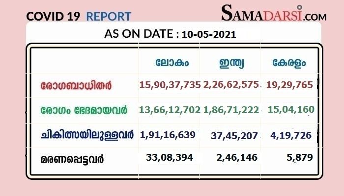 10/05/2021 തിങ്കളാഴ്ച രോഗം സ്ഥിരീകരിച്ചവരില് 255 പേര് സംസ്ഥാനത്തിന് പുറത്ത് നിന്നും വന്നവരാണ്. 24,815 പേര്ക്ക് സമ്പര്ക്കത്തിലൂടെയാണ് രോഗം ബാധിച്ചത്. 2303 പേരുടെ സമ്പര്ക്ക ഉറവിടം വ്യക്തമല്ല. തിരുവനന്തപുരം 3231, മലപ്പുറം 3253, തൃശൂര് 3249, എറണാകുളം 2699, കോഴിക്കോട് 2419, പാലക്കാട് 811, കൊല്ലം 2028, ആലപ്പുഴ 1906, കണ്ണൂര് 1617, കോട്ടയം 1589, കാസര്ഗോഡ് 886, പത്തനംതിട്ട 415, ഇടുക്കി 407, വയനാട് 305 എന്നിങ്ങനെയാണ് സമ്പര്ക്കത്തിലൂടെ രോഗം ബാധിച്ചത്.