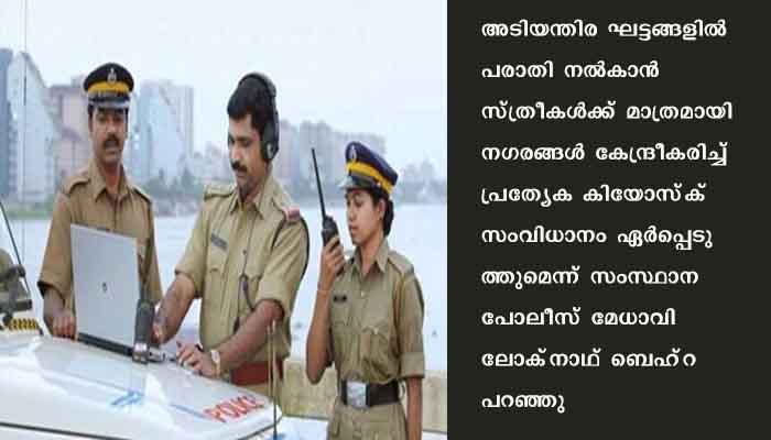 തിരുവനന്തപുരം: അടിയന്തിര ഘട്ടങ്ങളില് പരാതി നല്കാന് സ്ത്രീകള്ക്ക് മാത്രമായി നഗരങ്ങള് കേന്ദ്രീകരിച്ച് പ്രത്യേക കിയോസ്ക് സംവിധാനം ഏര്പ്പെടുത്തുമെന്ന് സംസ്ഥാന പോലീസ് മേധാവി ലോക്നാഥ് ബെഹ്റ പറഞ്ഞു. കൊച്ചിയില് ഹൈക്കോടതി കെട്ടിടത്തിന് സമീപത്തായി മറൈന് ഡ്രൈവിലാണ് ആദ്യഘട്ടത്തില് പദ്ധതി നടപ്പിലാക്കുന്നത്. കൊച്ചി ഡെപ്യൂട്ടികമ്മീഷണര്ക്കാണ് കിയോസ്ക്ക് സ്ഥാപിക്കുന്നതിന്റെ ചുമതല. സ്ത്രീകള്ക്ക് സുഗമമായി പരാതി നല്കാന് ഈ സംവിധാനത്തിലൂടെ കഴിയും.
