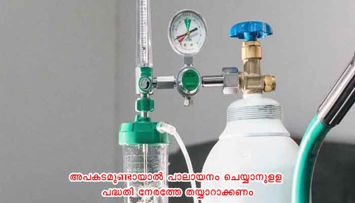 അപകടമുണ്ടായാല് പാലായനം ചെയ്യാനുളള പദ്ധതി നേരത്തേ തയ്യാറാക്കണം. അടിസ്ഥാന ഫയര് സേഫ്റ്റി ഉപകരണങ്ങല്, ഐസിയു പോലുളള അടച്ചിട്ട സ്ഥലങ്ങളില് ഇടക്കിടെ വായു പുറത്തുപോകാനുളള ക്രോസ് വെന്റിലേഷന് മെക്കാനിക്കല് വെന്റിലേഷന് തുടങ്ങിയവ സ്ഥാപിക്കേണ്ടതാണ്. തീപിടുത്ത സാധ്യതയുളള കര്ട്ടന് തുടങ്ങിയ വസ്തുക്കളുടെ ഉപയോഗം നിയന്ത്രിക്കണം. ഫയര് ആന്റ് സേഫ്റ്റി കമ്മറ്റി അപകടസാധ്യതകള് തിരിച്ചറിഞ്ഞ് അത് പരിഹരിക്കുകയും വേണം.