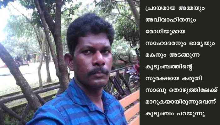 സാബു ഇലക്ട്രീഷ്യനായിരുന്നു. ഭാര്യ: സിജ. മാതാവ് കാളിക്കുട്ടി. മകന്: രണ്ടരവയസുകാരന് സിജ,