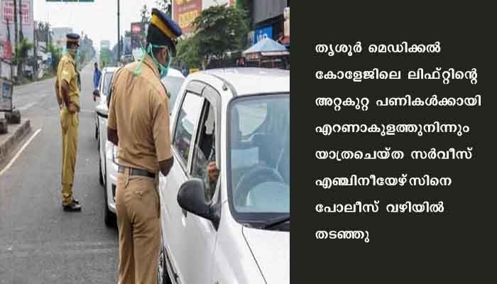 തൃശൂര്: തൃശൂര് മെഡിക്കല് കോളേജിലെ ലിഫ്റ്റിന്റെ അറ്റകുറ്റ പണികള്ക്കായി എറണാകുളത്തുനിന്നും യാത്രചെയ്ത സര്വീസ് എഞ്ചിനീയേഴ്സിനെ പോലീസ് വഴിയില് തടഞ്ഞു. കോളേജധികൃതരുടെ സാക്ഷ്യപത്രം ഉണ്ടായിട്ടും ലിഫ്റ്റ് അവശ്യ സര്വീസ് അല്ലെന്ന വാദത്തില് ഉറച്ചുനിന്ന പോലീസ് അവരെ വിടാന് കൂട്ടാക്കിയില്ല. നേരത്തെ അഭ്യന്തര വകുപ്പിന്റെ പാസിന് അപേക്ഷിച്ചിരുന്നെങ്കിലും നിരസിക്കപ്പെട്ടു.