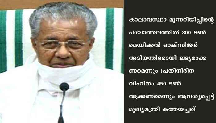 തിരുവനന്തപുരം: കേരളത്തിന്റെ ഓക്‌സിജന്‍ വിഹിതം 450 ടണ്‍ ആയി ഉയര്‍ത്തണം എന്നാവശ്യപ്പെട്ട് മുഖ്യമന്ത്രി പിണറായി വിജയന്‍ പ്രധാന മന്ത്രിക്ക് കത്തയച്ചു.കോവിഡ് കേസുകള്‍ വര്‍ദ്ധിക്കുന്ന സാഹചര്യത്തില്‍ ഓക്‌സിജന്‍ വിഹിതം 358 മെട്രിക്ക് ടണ്ണായി വര്‍ദ്ധിപ്പിച്ചിരുന്നു .ഇതിന് പിന്നാലെയാണ് കാലാവസ്ഥാ മുന്നറിയിപ്പിന്റെ പശ്ചാത്തലത്തില്‍ 300 ടണ്‍ മെഡിക്കല്‍ ഓക്‌സിജന്‍ അടിയന്തിരമായി ലഭ്യമാക്കണമെന്നും പ്രതിനിദിന വിഹിതം 450 ടണ്‍ ആക്കണമെന്നും ആവശ്യപ്പെട്ട് മുഖ്യമന്ത്രി കത്തയച്ചത്.