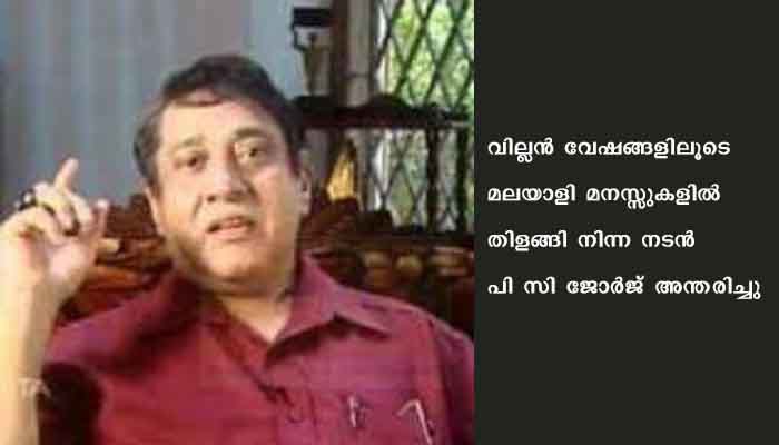 വില്ലൻ വേഷങ്ങളിലൂടെ മലയാളി മനസ്സുകളിൽ തിളങ്ങി നിന്ന നടൻ പിസി ജോർജ് അന്തരിച്ചു. ശാരീരികാസ്വസ്ഥ്യം മൂലം കുറച്ച് കാലമായി കലാരംഗത്തു നിന്നും വിട്ടു നിന്നിരുന്ന അദ്ദേഹം 13/05/21 എറണാകുളത്തെ സ്വകാര്യ ആശുപത്രിയിൽ വച്ചായിരുന്നു അന്ത്യം.