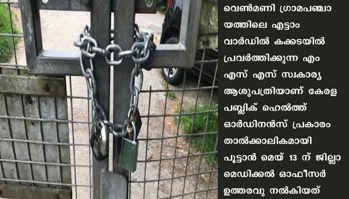 ആലപ്പുഴ: ആശുപത്രിയുടെ പ്രവര്ത്തനം പൊതുജനാരോഗ്യത്തിനു ഭീഷണിയാണെന്നു ചൂണ്ടിക്കാട്ടി പൂട്ടാന് ഉത്തരവ്. വെണ്മണി ഗ്രാമപഞ്ചായത്തിലെ എട്ടാം വാര്ഡില് കക്കടയില് പ്രവര്ത്തിക്കുന്ന എം എസ് എസ് സ്വകാര്യ ആശുപത്രിയാണ് കേരള പബ്ലിക് ഹെല്ത്ത് ഓര്ഡിനന്സ് പ്രകാരം താല്ക്കാലികമായി പൂട്ടാന് മെയ് 13 ന് ജില്ലാ മെഡിക്കല് ഓഫീസര് ഉത്തരവു നല്കിയത്.
