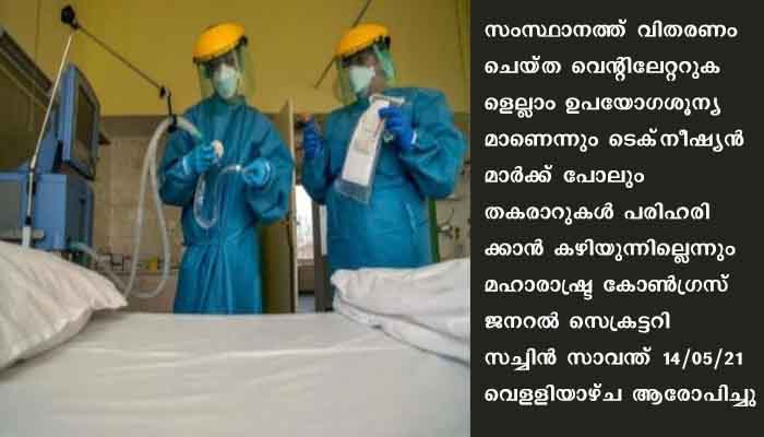 ഔറംഗബാദ് മെഡിക്കല് കോളേജ് വിദഗ്ധരാണ് വെന്റിലേറ്ററിലെ തകരാറുകള് കണ്ടെത്തിയതെന്നും അദ്ദേഹം പറഞ്ഞു. പൊതുജനങ്ങളുടെ പണമാണ് പി.എം കെയര് ഫണ്ടിലുള്ളതെന്നും മാപ്പര്ഹിക്കാത്ത തെറ്റാണ് വെന്റിലേറ്ററില് വിതരണത്തിലെ അനാസ്ഥയെന്നും സച്ചിന് പറഞ്ഞു.