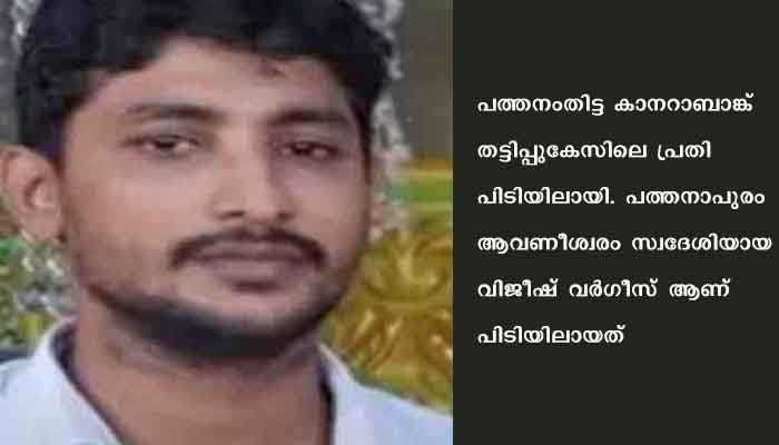 പത്തനംതിട്ട: പത്തനംതിട്ട കാനറാബാങ്ക് തട്ടിപ്പുകേസിലെ പ്രതി പിടിയിലായി. പത്തനാപുരം ആവണീശ്വരം സ്വദേശിയായ വിജീഷ് വര്ഗീസ് ആണ് പിടിയിലായത്. തട്ടിപ്പ് നടന്ന ബാങ്കിലെ ക്ലാര്ക്കായിരുന്നു ഇയാള്. മൂന്നുമാസമായി ഒളിവിലായിരുന്ന ഇയാളെ ബംഗളൂരുവില് നിന്നാണ് കസ്റ്റഡിയിലെടുത്തത്. എട്ടുകോടി രൂപയുടെ തട്ടിപ്പാണ് ഇയാള് നടത്തിയത്. പോലീസ് വ്യാപകമായി നടത്തിയ തെരച്ചിലിനൊടുവിലാണ് പ്രതി പിടിയിലാവുന്നത്.