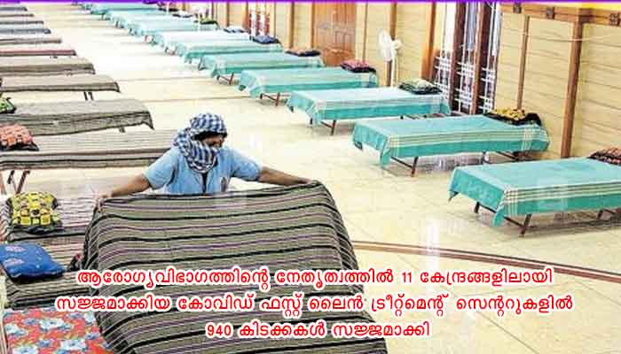 54 കിടക്കകൾ സജ്ജമാക്കിയിട്ടുണ്ട്. ഇവിടെ 22 പേർ ചികിത്സയിലുണ്ട്. ആരോഗ്യവിഭാഗത്തിന്റെ നേതൃത്വത്തിൽ 11 കേന്ദ്രങ്ങളിലായി സജ്ജമാക്കിയ കോവിഡ് ഫസ്റ്റ് ലൈൻ ട്രീറ്റ്മെന്റ് സെന്ററുകളിൽ 940 കിടക്കകൾ സജ്ജമാക്കി. ഇവിടങ്ങളിൽ 487 പേർ ചികിത്സയിലുണ്ട്. ജില്ലയിൽ 453 കിടക്കൾ വിവിധ ഫസ്റ്റ് ലൈൻ ട്രീറ്റ്മെന്റ് സെന്ററുകളിലായി ലഭ്യമാണ്.