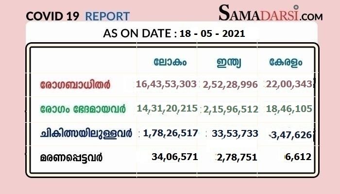 18/05/2021 ചൊവ്വാഴ്ച രോഗം സ്ഥിരീകരിച്ചവരില് 150 പേര് സംസ്ഥാനത്തിന് പുറത്ത് നിന്നും വന്നവരാണ്. 28,921 പേര്ക്ക് സമ്പര്ക്കത്തിലൂടെയാണ് രോഗം ബാധിച്ചത്. 2157 പേരുടെ സമ്പര്ക്ക ഉറവിടം വ്യക്തമല്ല. മലപ്പുറം 4149, എറണാകുളം 3377, തിരുവനന്തപുരം 3116, കൊല്ലം 3309, പാലക്കാട് 1689, കോഴിക്കോട് 2416, ആലപ്പുഴ 2331, തൃശൂര് 2294, കോട്ടയം 1726, കണ്ണൂര് 1271, പത്തനംതിട്ട 1114, ഇടുക്കി 804, കാസര്ഗോഡ് 714, വയനാട് 611 എന്നിങ്ങനെയാണ് സമ്പര്ക്കത്തിലൂടെ രോഗം ബാധിച്ചത്.