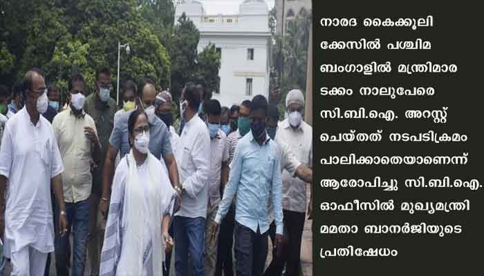 കൊല്‍ക്കത്ത: നാരദ കൈക്കൂലിക്കേസില്‍ പശ്ചിമ ബംഗാളില്‍ മന്ത്രിമാരടക്കം നാലുപേരെ സി.ബി.ഐ. അറസ്റ്റ് ചെയ്തത് നടപടിക്രമം പാലിക്കാതെയാണെന്ന് ആരോപിച്ചു സി.ബി.ഐ. ഓഫീസില്‍ മുഖ്യമന്ത്രി മമതാ ബാനര്‍ജിയുടെ പ്രതിഷേധം. തന്നെയും അറസ്റ്റ് ചെയ്യണമെന്നാവശ്യപ്പെട്ട മമത ആറു മണിക്കൂറിലേറെ സി.ബി.ഐ. ഓഫീസില്‍ തുടര്‍ന്നു. മമത ബാനര്‍ജിയുടെ നേതൃത്വത്തില്‍ തൃണമൂല്‍ കോണ്‍ഗ്രസ് സര്‍ക്കാര്‍ വീണ്ടും അധികാരമേറ്റതിനു പിന്നാലെ കേന്ദ്രം തുടരുന്ന പ്രതികാരനടപടികളുടെ ഭാഗമാണ് അറസ്റ്റെന്ന് പാര്‍ട്ടി ആരോപിച്ചു. നിയമസഭാംഗങ്ങള്‍ക്ക് എതിരേയുള്ള പ്രോസിക്യൂഷന്‍ നടപടികള്‍ക്കു സ്പീക്കറാണ് അനുമതി നല്‍കേണ്ടതെങ്കിലും സി.ബി.ഐ. സ്പീക്കറെ മറികടന്ന് ഗവര്‍ണറെ സമീപിക്കുകയായിരുന്നു.മന്ത്രിമാരുടെ അറസ്റ്റില്‍ പ്രതിഷേധിച്ച് സി.ബി.ഐ. ഓഫീസിനു മുന്നില്‍ തടിച്ചുകൂടിയ തൃണമൂല്‍ പ്രവര്‍ത്തകര്‍ ബാരിക്കേഡുകള്‍ തകര്‍ത്തു. അര്‍ധ െസെനിക വിഭാഗങ്ങള്‍ക്കുനേരേ കല്ലേറുമുണ്ടായി.ഇതോടെ സുരക്ഷാസേനാംഗങ്ങള്‍ ലാത്തിച്ചാര്‍ജ് നടത്തി.