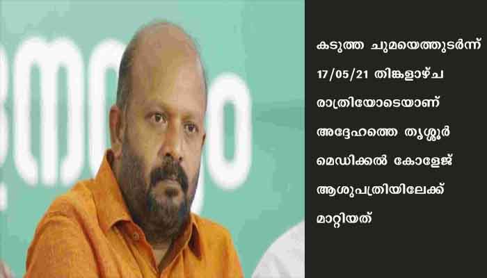 തൃശ്ശൂർ: വിഎസ് സുനിൽ കുമാറിനെ ആശുപത്രിയിൽ പ്രവേശിപ്പിച്ചു. കടുത്ത ചുമയെത്തുടർന്ന് 17/05/21 തിങ്കളാഴ്ച രാത്രിയോടെയാണ് അദ്ദേഹത്തെ തൃശ്ശൂർ മെഡിക്കൽ കോളജ് ആശുപത്രിയിലേക്ക് മാറ്റിയത്. കോവിഡാനന്തര ചികിത്സയിൽ കഴിയുന്നതിനിടെയാണ് അസ്വസ്ഥകൾ കൂടിയതിനെ തുടർന്ന് ആശുപത്രിയിലേക്ക് മാറ്റിയിരിക്കുന്നത്.