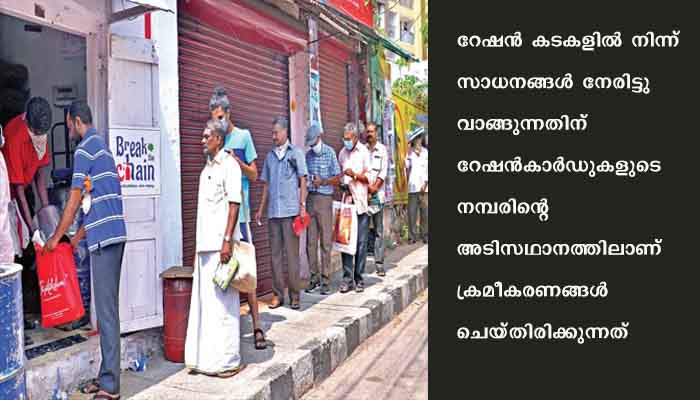 1,2,3, എന്നീ നമ്പരുകളില് അവസാനിക്കുന്ന റേഷന്കാര്ഡ് ഉടമകള്ക്ക് തിങ്കള്,ചൊവ്വ ദിവസങ്ങളില് സാധനങ്ങള് നേരിട്ടുവാങ്ങാം . 4,5,6 നമ്പരുകളില് അവസാനിക്കുന്ന കാര്ഡുടമകള് ബുധന്, വ്യാഴം ദിവസങ്ങളിലും 7,8,9,0 എന്നീ അക്കങ്ങളില് അവസാനിക്കുന്ന കാര്ഡുടമകള് വെളളി, ശനി ദിവസങ്ങളിലും സാധനങ്ങള് വാങ്ങാവുന്നതാണ്.