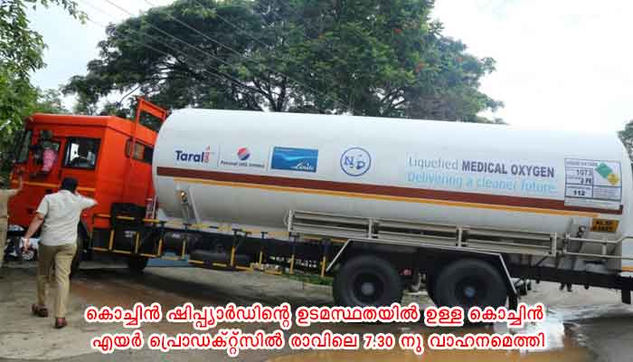 എറണാകുളം: ദുരന്ത നിവാരണ നിയമ പ്രകാരം മോട്ടോർ വാഹന വകുപ്പ് പിടിച്ചെടുത്ത 3 ടാങ്കറുകളിൽ ഒന്ന് ജാർഖണ്ഡിൽ നിന്ന് ദ്രവീകൃത ഓക്സിജനുമായി കൊച്ചിയിൽ തിരിച്ചെത്തി. ജാർഖണ്ഡിലെ ബേൺപൂരിലുള്ള ടാറ്റാ സ്റ്റീൽ പ്ലാന്റിൽ നിന്നുമാണ് ദ്രവീകരിച്ച ഓക്സിജൻ നിറച്ച് ടാങ്കർ തിരിച്ചെത്തിയത്. കൊച്ചിൻ ഷിപ്പ്യാർഡിന്റെ ഉടമസ്ഥതയിൽ ഉള്ള കൊച്ചിൻ എയർ പ്രൊഡക്റ്റ്സിൽ രാവിലെ 7.30 നു വാഹനമെത്തി. ജാർഖണ്ഡ്, പശ്ചിമ ബംഗാൾ, ഒഡീഷ, ആന്ധ്രാപ്രദേശ്, തമിഴ്നാട് എന്നീ സംസ്ഥാനങ്ങളിലൂടെ 2400 ഓളം കിലോമീറ്റർ സഞ്ചരിച്ചാണ് ടാങ്കർ കൊച്ചിയിൽ എത്തിയത്. യാത്രക്കിടയിൽ ആന്ധ്രയിലെ ശ്രീകാകുളത്തു വച്ചു വാഹനം ബ്രേക്ക് ഡൌൺ ആയെങ്കിലും ടാറ്റാ ഡീലർഷിപ് മുഖേന തകരാറുകൾ പരിഹരിച്ചു 8 മണിക്കൂറിനകം തന്നെ വാഹനം യാത്ര തുടർന്നു. കെ.എസ്. ആർ.ടി.സി യുടെ പ്രത്യേക പരിശീലനം ലഭിച്ച 3 ഡ്രൈവർമാരും, ഒരു അസിസ്റ്റന്റ് മോട്ടോർ വെഹിക്കിൾസ് ഇൻസ്പെക്ടറും ആണ് ടാങ്കർ ലോറിയിൽ ഉണ്ടായിരുന്നത്.
