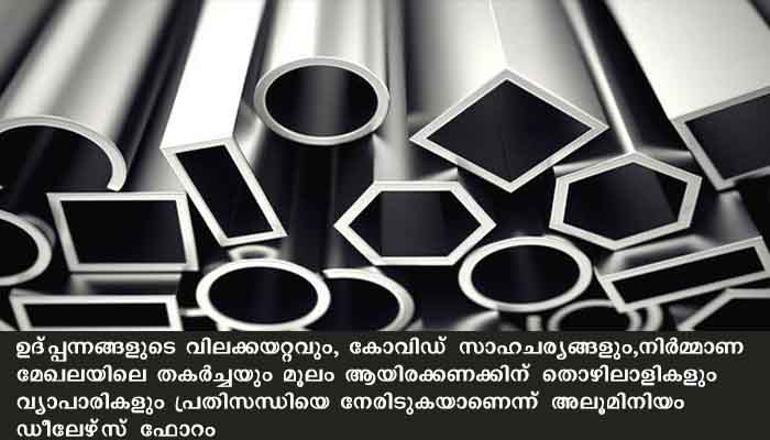 കൊച്ചി: ഉദ്പ്പന്നങ്ങളുടെ വിലക്കയറ്റവും, കോവിഡ് സാഹചര്യങ്ങളും,നിര്മ്മാണ മേഖലയിലെ തകര്ച്ചയും മൂലം ആയിരക്കണക്കിന് തൊഴിലാളികളും വ്യാപാരികളും പ്രതിസന്ധിയെ നേരിടുകയാണെന്ന് അലൂമിനിയം ഡീലേഴ്സ് ഫോറം. അലുമിനിയത്തിനുണ്ടായ വിലക്കയറ്റം 50 ശതമാനത്തിലധികമാണ്. ഇതോടൊപ്പം കോവിഡ് വ്യാപനവും ലോക്കഡൗണും വന്നതോടെ തകര്ച്ച പൂര്ണമായെന്നും പരിഹാരമുണ്ടാക്കാന് അടിയന്തിര നടപടി വേണമെന്നും സംഘടനയുടെ സംസ്ഥാന ഭാരവാഹികളായ ഷജല് മുഹമ്മദ്, മധുബെന് അബ്രാഹം, ബൈജു കെ തോമസ് എന്നിവര് സര്ക്കാരിനോട് ആവശ്യപ്പെട്ടു.