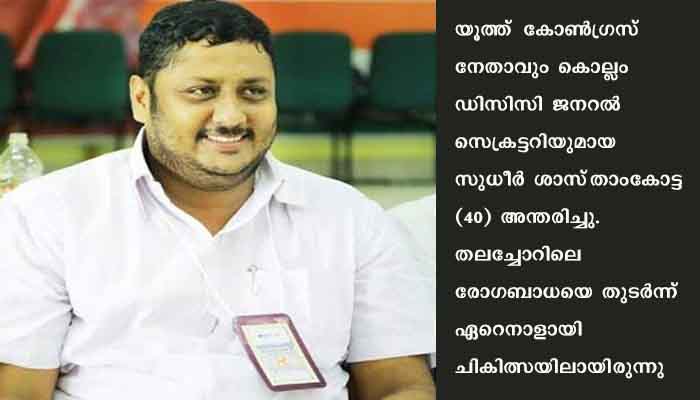 കൊല്ലം: യൂത്ത് കോണ്ഗ്രസ് നേതാവും കൊല്ലം ഡിസിസി ജനറല് സെക്രട്ടറിയുമായ സുധീര് ശാസ്താംകോട്ട(40) അന്തരിച്ചു. തലച്ചോറിലെ രോഗബാധയെ തുടര്ന്ന് ഏറെനാളായി ചികിത്സയിലായിരുന്നു. കെഎസ് യുവിലൂടെ രാഷ്ട്രീയത്തിലെത്തിയ അദ്ദേഹം കേരളത്തിലെ യുവജന സമരങ്ങളുടെ മുന്നിര പോരാളിയായിരുന്നു.പലതവണ പോലീസിന്റെ ലാത്തിയടിയേറ്റ് ചികിത്സ തേടിയിരുന്നു. കെഎസ് യു. സംസ്ഥാന സെക്രട്ടറി, യൂത്ത് കോണ്ഗ്രസ് സംസ്ഥാന സെക്രട്ടറി എന്നീ സ്ഥാനങ്ങള് വഹിച്ചു.