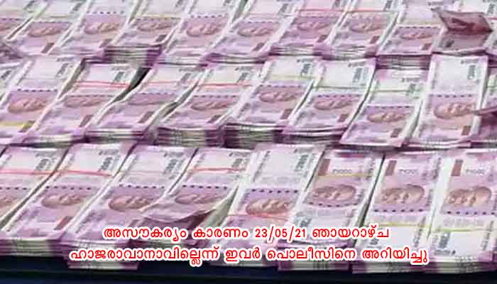 തൃശൂര്: കൊടകര കുഴല്പ്പണക്കേസില് ബിജെപി നേതാക്കള് ചോദ്യം ചെയ്യലിന് ഹാജരായില്ല. അസൗകര്യം കാരണം 23/05/21 ഞായറാഴ്ച ഹാജരാവാനാവില്ലെന്ന് ഇവര് പൊലീസിനെ അറിയിച്ചു. ബിജെപി സംസ്ഥാന സംഘടന സെക്രട്ടറി എം ഗണേശും ഓഫീസ് സെക്രട്ടറി ഗിരീഷനെയുമാണ് ഞായറാഴ്ച തൃശൂര് പൊലീസ് ക്ലബില് ചോദ്യം ചെയ്യാനിരുന്നത്.