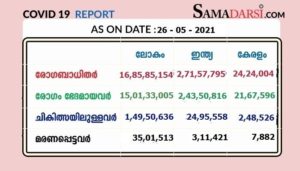 26/05/2021 ബുധനാഴ്ച രോഗം സ്ഥിരീകരിച്ചവരില് 184 പേര് സംസ്ഥാനത്തിന് പുറത്ത് നിന്നും വന്നവരാണ്. 26,860 പേര്ക്ക് സമ്പര്ക്കത്തിലൂടെയാണ് രോഗം ബാധിച്ചത്. 1663 പേരുടെ സമ്പര്ക്ക ഉറവിടം വ്യക്തമല്ല. മലപ്പുറം 4587, എറണാകുളം 3321, പാലക്കാട് 1846, കൊല്ലം 2824, തിരുവനന്തപുരം 2705, തൃശൂര് 2187, ആലപ്പുഴ 2168, കോഴിക്കോട് 1780, കോട്ടയം 1413, കണ്ണൂര് 1199, ഇടുക്കി 981, പത്തനംതിട്ട 884, കാസര്ഗോഡ് 556, വയനാട് 359 എന്നിങ്ങനെയാണ് സമ്പര്ക്കത്തിലൂടെ രോഗം ബാധിച്ചത്.
