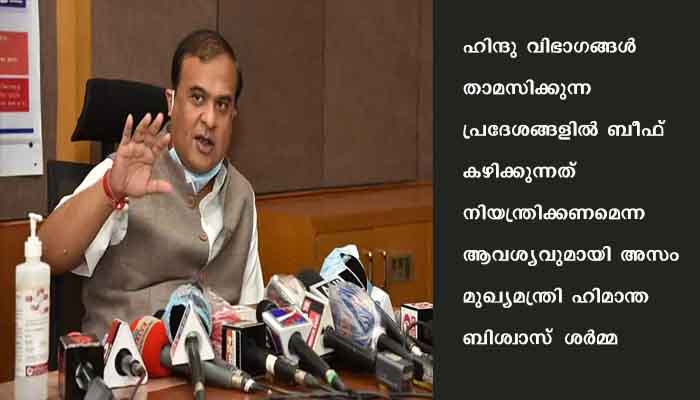 അസം: ഹിന്ദു വിഭാഗങ്ങള്‍ താമസിക്കുന്ന പ്രദേശങ്ങളില്‍ ബീഫ്‌ കഴിക്കുന്നത്‌ നിയന്ത്രിക്കണമെന്ന ആവശ്യവുമായി അസം മുഖ്യമന്ത്രി ഹിമാന്ത ബിശ്വാസ്‌ ശര്‍മ്മ. ഗവര്‍ണറുടെ നന്ദിപ്രമേയ ചര്‍ച്ചയില്‍ 2021 മെയ്‌ 24ന്‌ തിങ്കളാഴ്‌ചയാണ്‌ മുഖ്യമന്ത്രി ഈ ആവശ്യവുമായി രംഗത്തുവന്നത്‌. അദ്ദേഹം പറയുന്നു: ‘ പശുവിനെ അമ്മയായി കണ്ടാണ്‌ നമ്മള്‍ ആരാധിക്കുന്നത്‌. ആരുടെയും ഭക്ഷണരീതി മാറ്റണമെന്നല്ല ആവശ്യപ്പെടുന്നത്‌. പക്ഷെ ഹിന്ദുവിഭാഗത്തിലുളളവര്‍ താമസിക്കുന്ന ഇടങ്ങളില്‍ ബീഫ്‌ കഴിക്കരുതെന്ന ലക്‌നൗവിലെ ദാറുല്‍ ഉലുമിന്റെ പ്രസ്‌താവന പലതവണ താന്‍ ശ്രദ്ധിച്ചിട്ടുണ്ടെന്നും ബിമാന്ത ബിശ്വാസ്‌ ശര്‍മ്മ പറഞ്ഞു.
