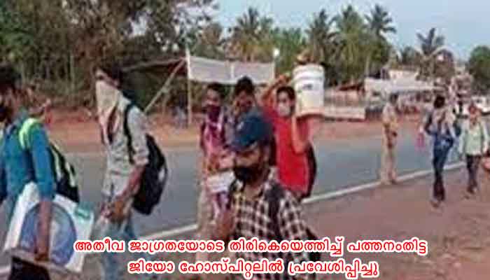 അതീവ ജാഗ്രതയോടെ തിരികെയെത്തിച്ച് പത്തനംതിട്ട ജിയോ ഹോസ്പിറ്റലില് പ്രവേശിപ്പിച്ചു. ഹോട്ടല് ജീവനക്കാരനായ ഇയാളോടൊപ്പം ജോലി ചെയ്യുകയും താമസിക്കുകയും ചെയ്തിരുന്ന 25 അതിഥി തൊഴിലാളികളുടെ കോവിഡ് ടെസ്റ്റ് നടത്തുന്നതിന് ആരോഗ്യവകുപ്പിന് വിവരങ്ങള് കൈമാറിയിട്ടുണ്ട്. ഈ വ്യക്തിയിലൂടെ റെയില്വേ ഉള്പ്പെടെ പല തലങ്ങളില് ഉണ്ടാകുമായിരുന്ന രോഗവ്യാപനം തടയുവാന് സമയോചിതമായ ഇടപെടലിലൂടെ സാധിച്ചതായി ജില്ലാ ലേബര് ഓഫീസര് പറഞ്ഞു.