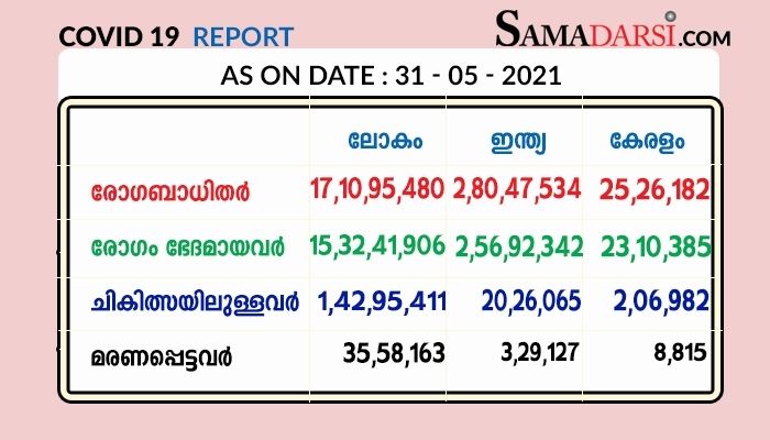 കഴിഞ്ഞ ദിവസങ്ങളിലുണ്ടായ 174 മരണങ്ങളാണ് കോവിഡ്-19 മൂലമാണെന്ന് 31/05/2021 തിങ്കളാഴ്ച സ്ഥിരീകരിച്ചത്. ഇതോടെ ആകെ മരണം 8815 ആയി.