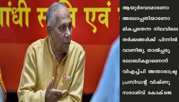 ന്യൂഡല്ഹി: ആയുര്വേദമാണോ അലോപ്പതിയാണോ മികച്ചതെന്ന നിലവിലെ തര്ക്കങ്ങള്ക്ക് പിന്നില് വാണിജ്യ താല്പ്പര്യ ലോബികളാണെന്ന് വിഎച്ച്പി അന്താരാഷ്ട്ര പ്രസിഡന്റ് വിഷ്ണു സദാശിവ് കോക്ജെ. രണ്ട് വൈദ്യശാസ്ത്ര മേഖലകളെയും പിന്തുണയ്ക്കുന്നവരോട് അവരുടെ കണ്ടെത്തലുകളുടെ വിവരങ്ങള് പുറത്തുവിടാന് ആവശ്യപ്പെട്ട അദ്ദേഹം കോവിഡ് -19 രോഗികളില് ആയുര്വേദവും അലോപ്പതിയും ചെലുത്തിയ സ്വാധീനത്തെക്കുറിച്ച് ശാസ്ത്രീയ ചര്ച്ചയാണ് വേണ്ടതെന്നും വ്യക്തമാക്കി. രോഗികളില് പാര്ശ്വഫലങ്ങള് ഉണ്ടാക്കാത്തവയാണ് ആയുര്വേദമെന്നും അദ്ദേഹം ചൂണ്ടികാട്ടി.അലോപ്പതിയെക്കുറിച്ചുള്ള യോഗ ഗുരു രാംദേവിന്റെ വീക്ഷണങ്ങള്ക്കെതിരേ ഇന്ത്യന് മെഡിക്കല് അസോസിയേഷന് കടുത്ത വിമര്ശനം ഉന്നയിച്ച പശ്ചാത്തലത്തില് കൂടിയാണ് കോക്ജെ ഇക്കാര്യം വ്യക്തമാക്കിയതെന്നത് ശ്രദ്ധേയമാണ്. രോഗികള്ക്ക് അവരുടെ രോഗം ലഘൂകരിക്കുന്ന വൈദ്യശാസ്ത്ര മേഖലയോടാവും താല്പര്യം. അലോപ്പതിയെ ആശ്രയിക്കുന്ന നിരവധി പേര് ഇന്ത്യയിലുണ്ട്. അതിനാല് തന്നെ അതില് നിന്ന് പൂര്ണമായും അകലമം പാലിക്കുക സാധ്യതമല്ലെന്നും അദ്ദേഹം കൂട്ടിച്ചേര്ത്തു.അലോപ്പതി ഫാര്മസ്യൂട്ടിക്കല് കമ്പനികളും ഡോക്ടര്മാരും ആരോഗ്യരംഗത്തെ തങ്ങളുടെ ആധിപത്യം അപകടത്തിലാവുമെന്ന ഭയത്തിലാണ്.