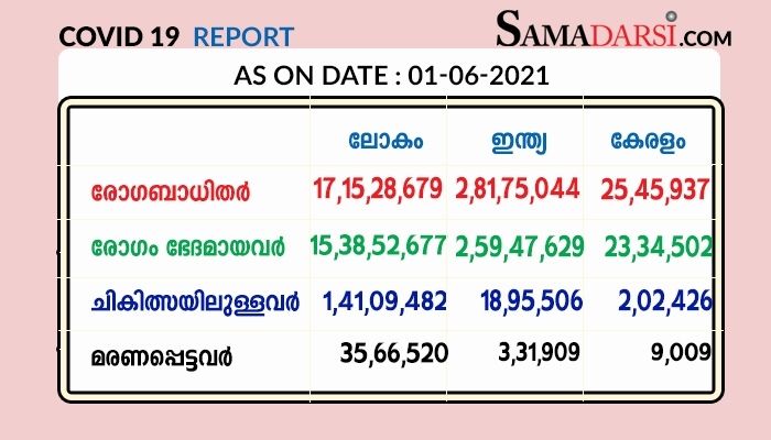 01/06/2021 ചൊവ്വാഴ്ച രോഗം സ്ഥിരീകരിച്ചവരില് 104 പേര് സംസ്ഥാനത്തിന് പുറത്ത് നിന്നും വന്നവരാണ്. 18,393 പേര്ക്ക് സമ്പര്ക്കത്തിലൂടെയാണ് രോഗം ബാധിച്ചത്. 1189 പേരുടെ സമ്പര്ക്ക ഉറവിടം വ്യക്തമല്ല. മലപ്പുറം 2800, തിരുവനന്തപുരം 2246, പാലക്കാട് 1282, കൊല്ലം 2145, എറണാകുളം 2017, തൃശൂര് 1586, ആലപ്പുഴ 1548, കോഴിക്കോട് 1331, കോട്ടയം 849, കണ്ണൂര് 785, പത്തനംതിട്ട 677, ഇടുക്കി 448, കാസര്ഗോഡ് 426, വയനാട് 253 എന്നിങ്ങനെയാണ് സമ്പര്ക്കത്തിലൂടെ രോഗം ബാധിച്ചത്.