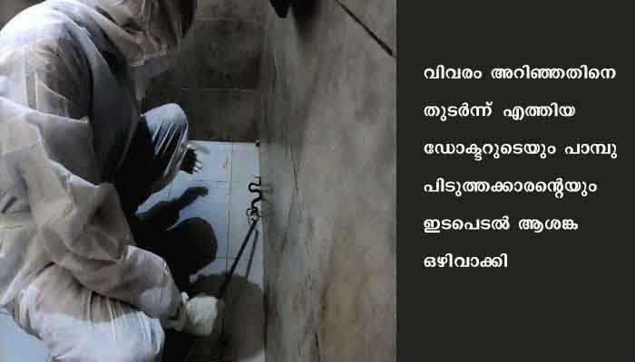 തിരുവനന്തപുരം: മൂന്ന് കോവിഡ് രോഗികള് മാത്രമുളള വീട്ടില് മൂര്ഖന് പാമ്പ്. വിവരം അറിഞ്ഞതിനെ തുടര്ന്ന് എത്തിയ ഡോക്ടറുടെയും പാമ്പു പിടുത്തക്കാരന്റെയും ഇടപെടല് ആശങ്ക ഒഴിവാക്കി. 2021 മെയ് 31 ഉച്ചക്ക് 12.30 ഓടെയായിരുന്നു സംഭവം ശാസ്തമംഗലം പൈപ്പിന് മൂട്ടിലെ ബാത്ത്റൂമിലാണ് മൂന്നുമാസം പ്രയമുളള പാമ്പിന്കുഞ്ഞിനെ കണ്ടത്.