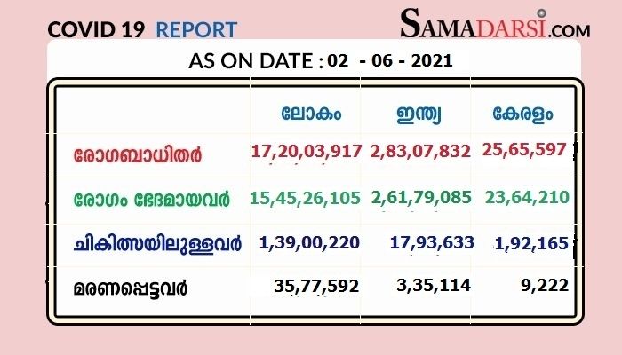 കഴിഞ്ഞ ദിവസങ്ങളിലുണ്ടായ 213 മരണങ്ങളാണ് കോവിഡ്-19 മൂലമാണെന്ന് 02/06/2021 ബുധനാഴ്ച സ്ഥിരീകരിച്ചത്. ഇതോടെ ആകെ മരണം 9222 ആയി.