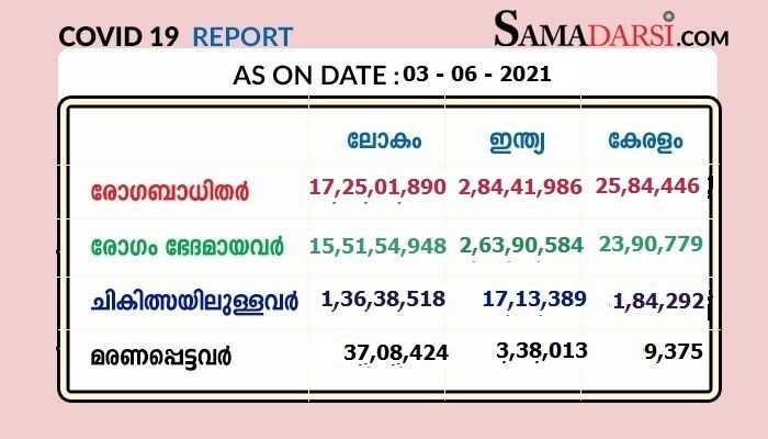 03/06/2021 വ്യാഴാഴ്ച രോഗം സ്ഥിരീകരിച്ചവരില്‍ 110 പേര്‍ സംസ്ഥാനത്തിന് പുറത്ത് നിന്നും വന്നവരാണ്. 17,521 പേര്‍ക്ക് സമ്പര്‍ക്കത്തിലൂടെയാണ് രോഗം ബാധിച്ചത്. 1143 പേരുടെ സമ്പര്‍ക്ക ഉറവിടം വ്യക്തമല്ല. മലപ്പുറം 2390, കൊല്ലം 2260, പാലക്കാട് 1393, തിരുവനന്തപുരം 2022, എറണാകുളം 1979, തൃശൂര്‍ 1747, ആലപ്പുഴ 1318, കോഴിക്കോട് 1175, കണ്ണൂര്‍ 757, കോട്ടയം 669, പത്തനംതിട്ട 568, കാസര്‍ഗോഡ് 547, ഇടുക്കി 483, വയനാട് 213 എന്നിങ്ങനെയാണ് സമ്പര്‍ക്കത്തിലൂടെ രോഗം ബാധിച്ചത്.
