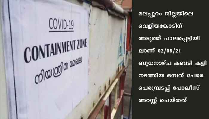 മലപ്പുറം: മലപ്പുറത്ത് കണ്ടെയിന്‍മെന്റ് സോണില്‍ കബടി കളി നടത്തിയവര്‍ പിടിയില്‍. മലപ്പുറം ജില്ലയിലെ വെളിയങ്കോടിന് അടുത്ത് പാലപ്പെട്ടിയിലാണ് 02/06/21 ബുധനാഴ്ച കബടി കളി നടത്തിയ ഒമ്പത് പേരെ പെരുമ്പടപ്പ് പോലീസ് അറസ്റ്റ് ചെയ്തത്. പാലപ്പെട്ടി കണ്ടെയിന്‍മെന്റ് സോണിലായിരുന്നു. ഇവിടെയാണ് നിയന്ത്രണങ്ങള്‍ ലംഘിച്ച് ഒമ്പതോളം പേര്‍ കബടി കളി നടത്തിയത്.