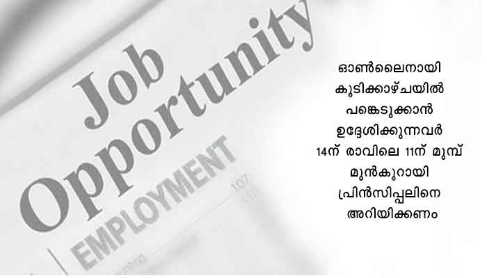 ഓൺലൈനായി കൂടിക്കാഴ്ചയിൽ പങ്കെടുക്കാൻ ഉദ്ദേശിക്കുന്നവർ 14ന് രാവിലെ 11ന് മുമ്പ് മുൻകൂറായി പ്രിൻസിപ്പലിനെ അറിയിക്കണം. അപ്ലൈഡ് ആർട്ട് ലക്ചറർക്ക് ബി.എഫ്.എ (അപ്ലൈഡ് ആർട്ട്)ന് 50 ശതമാനത്തിന് മുകളിൽ മാർക്കാണ് വിദ്യാഭ്യാസ യോഗ്യത. ഗ്രാഫിക്സ് (പ്രിന്റ് മേക്കിംഗ്) ലക്ചറർക്ക് എം.വി.എ/എം.എഫ്.എ ഗ്രാഫിക്സ് (പ്രിന്റ് മേക്കിംഗ്) യോഗ്യതയും പെയിന്റിംഗ് ലക്ചറർക്ക് ബി.എഫ്.എ/എം.എഫ്.എ പെയിന്റിംഗ് യോഗ്യതയും വേണം.