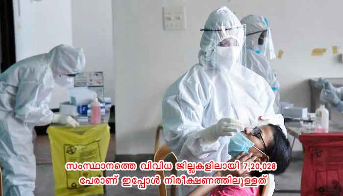 സംസ്ഥാനത്തെ വിവിധ ജില്ലകളിലായി 7,20,028 പേരാണ് ഇപ്പോള് നിരീക്ഷണത്തിലുള്ളത്. ഇവരില് 6,83,851 പേര് വീട്/ഇന്സ്റ്റിറ്റിയൂഷണല് ക്വാറന്റൈനിലും 36,177 പേര് ആശുപത്രികളിലും നിരീക്ഷണത്തിലാണ്. 2907 പേരെയാണ് പുതുതായി ആശുപത്രിയില് പ്രവേശിപ്പിച്ചത്.