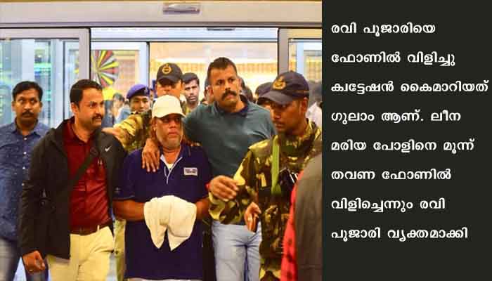 കാസർഗോഡ് സ്വദേശി ജിയ, മൈസൂർ സ്വദേശി ഗുലാം എന്നിവർ വഴിയാണ് ഇടപാടുകൾ നടത്തിയതെന്ന് രവി പൂജാരി വെളിപ്പെടുത്തിയിട്ടുണ്ട്. രവി പൂജാരിയെ ഫോണിൽ വിളിച്ചു ക്വട്ടേഷൻ കൈമാറിയത് ഗുലാം ആണ്. ലീന മരിയ പോളിനെ മൂന്ന് തവണ ഫോണിൽ വിളിച്ചെന്നും രവി പൂജാരി വ്യക്തമാക്കി. വാട്സ്ആപ് കാൾ വഴി ആയിരുന്നു ഫോൺ വിളിച്ചത്.