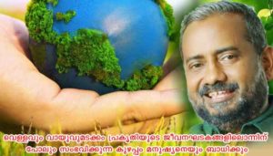 തദ്ദേശ പരിസ്ഥിതി നമ്മളിൽനിന്ന് അന്യമാണെന്നതായിരുന്നു എല്ലാവരുടെയും ധാരണ. എന്നാൽ ആഗോളതാപനമടക്കം നമ്മെ പലരൂപത്തിൽ ബാധിക്കുന്നു. പരമ്പരാഗത കാലാവസ്ഥ തകിടം മറിഞ്ഞു. പ്രകൃതിക്ക് വല്ലാത്ത പരുക്ക് പറ്റിയിരിക്കുന്നു. വെള്ളവും വായുവുമടക്കം പ്രകൃതിയുടെ ജീവനഘടകങ്ങളിലൊന്നിന് പോലും സംഭവിക്കുന്ന കുഴപ്പം മനുഷ്യനെയും ബാധിക്കും. പ്രകൃതിയെ സംരക്ഷിച്ചാലേ മനുഷ്യൻ നേരിടുന്ന പ്രശ്നങ്ങൾക്കും പരിഹാരമാകൂവെന്നും അദ്ദേഹം പറഞ്ഞു.