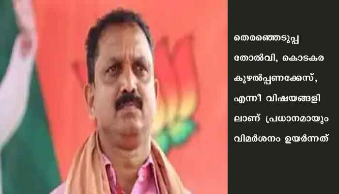 കൊച്ചി : ബിജെപി കോര്കമ്മറ്റി യോഗത്തില് സംസ്ഥാന അദ്ധ്യക്ഷന് കെ,സുരേന്ദ്രനും സംസ്ഥാന നേതൃത്വത്തിനും എതിരെ രൂക്ഷവിമര്ശനം . തെരഞ്ഞെടുപ്പ തോല്വി, ,കൊടകര കുഴല്പ്പണക്കേസ്, എന്നീ വിഷയങ്ങളിലാണ് പ്രധാനമായും വിമര്ശനം ഉയര്ന്നത്. പാര്ട്ടിയില് സമഗ്രമായ അഴിച്ചുപണി വേണമെന്ന് കൃഷ്ണദാസ് പക്ഷം ആവശ്യപ്പെട്ടു. ഒപ്പം പാര്ട്ടി അദ്ധ്യക്ഷനും സംഘടനാ സെക്രട്ടറിയും എടുക്കുന്ന തീരുമാനങ്ങള് ഏകപക്ഷീയമായി പാര്ട്ടിയില് നടപ്പിലാക്കുന്നതായും കൃഷ്ണദാസ് പക്ഷം ആരോപിച്ചു.