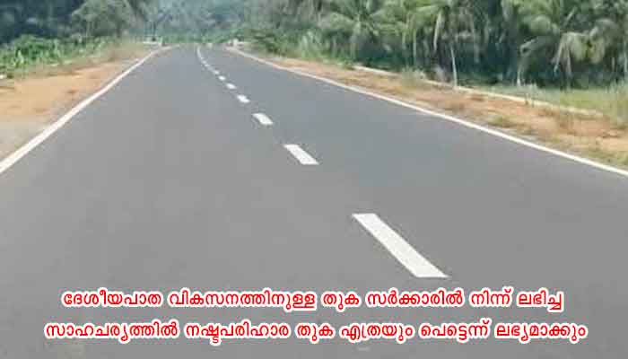 ദേശീയപാത വികസനത്തിനുള്ള തുക സര്‍ക്കാരില്‍ നിന്ന് ലഭിച്ച സാഹചര്യത്തില്‍ നഷ്ടപരിഹാര തുക എത്രയും പെട്ടെന്ന് ലഭ്യമാക്കും. ഇതിന് കാലതാമസം ഉണ്ടാവുകയില്ലെന്നും കലക്ടര്‍ എസ് ഷാനവാസ് വ്യക്തമാക്കി. ലോക്ഡൗണ്‍ സൗഹചര്യത്തില്‍ പ്രദേശത്തെ ജനങ്ങള്‍ക്ക് ബന്ധപ്പെട്ട രേഖകള്‍ ലഭ്യമാക്കുന്നതിന് സൗകര്യം ഒരുക്കും. ഇതിനായി പ്രദേശത്തെ വില്ലേജ് ഓഫീസ്, സബ് രജിസ്റ്റര്‍ ഓഫീസ് എന്നിവ തുറന്നു പ്രവര്‍ത്തിക്കുന്നതിന് പ്രത്യേക അനുമതി നല്‍കും.