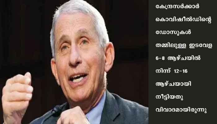 ഫൈസറിന് മൂന്നാഴ്ച ഇടവേളയും മൊഡേണയ്ക്കു നാലാഴ്ചയുമാണ് ഉത്തമമെന്നും അദ്ദേഹം പറഞ്ഞു. ഇടവേള നീട്ടുന്നത് രോഗവ്യാപനത്തിന് കാരണമാവും. യുകെയില് അത് നമ്മള് കണ്ടതാണ്. ഇടവേള നീട്ടിയതോടെ രോഗികളുടെ എണ്ണം കൂടി. അതുകൊണ്ടു തന്നെ മുന്നിര്ദേശങ്ങള് പാലിക്കുന്നതാണ് നല്ലതെന്നും ഫൗചി പറഞ്ഞു. തീവ്രവ്യാപനശേഷിയുള്ള ഡെല്റ്റ വകഭേദം നേരിടാന് വാക്സിനേഷന് വേഗത്തിലാക്കുകയാണ് വേണ്ടതെന്നും ഡെല്റ്റ വകഭേദം കണ്ടെത്തിയ ഇന്ത്യ പോലുള്ള രാജ്യങ്ങള് അതീവ ജാഗ്രത പാലിക്കണമെന്നും അദ്ദേഹം പറഞ്ഞു. കൊവിഡിന് എതിരായ പോരാട്ടത്തിലെ മുഖ്യ ആയുധം വാക്സിന് ആണെന്നും ഡോ ഫൗചി കൂട്ടിച്ചേര്ത്തു.