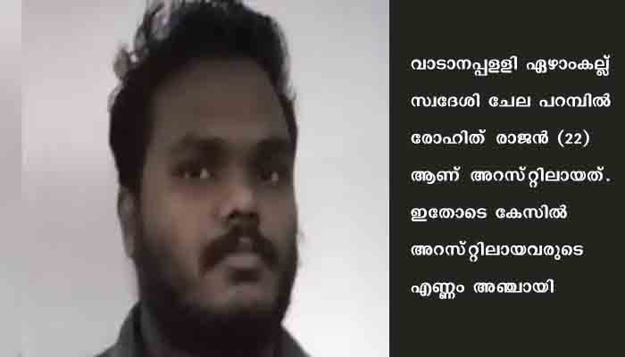 തൃശൂര്: തൃത്തല്ലൂരില് വാക്സിനേഷന് കേന്ദ്രത്തിന് സമീപം ബിജെപി പ്രവര്ത്തകര് തമ്മിലുണ്ടായ സംഘര്ഷത്തില് യുവാവിന് കുത്തേറ്റ സംഭവത്തില് ഒരാള്കൂടി അറസ്റ്റിലായി. വാടാനപ്പളളി ഏഴാംകല്ല് സ്വദേശി ചേല പറമ്പില് രോഹിത് രാജന് (22)ആണ് അറസ്റ്റിലായത്. ഇതോടെ കേസില് അറസ്റ്റിലായവരുടെ എണ്ണം അഞ്ചായി.