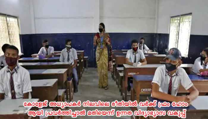 തിരുവനന്തപുരം: ലോക്ക്ഡൗൺ നിയന്ത്രണങ്ങൾ ഭാഗികമായി മാത്രം പിൻവലിച്ച സാഹചര്യത്തിൽ കോളേജ് അധ്യാപകർ നിലവിലെ രീതിയിൽ വർക്ക് ഫ്രം ഹോം ആയി പ്രവർത്തിച്ചാൽ മതിയെന്ന് ഉന്നത വിദ്യാഭ്യാസ വകുപ്പ് ഉത്തരവിറക്കി. പരീക്ഷാ ചുമതലകളും പ്രിൻസിപ്പൽ നിർദ്ദേശിക്കുന്ന മറ്റു ജോലികളും നിർവഹിക്കേണ്ട അധ്യാപകർ അതാതു ദിവസങ്ങളിൽ കോളേജിൽ ഹാജരാകണം. കോളേജുകളിലെ അനധ്യാപകർ സർക്കാരിന്റെ പൊതുഉത്തരവിന്റെ അടിസ്ഥാനത്തിൽ ജോലിക്ക് ഹാജരാകണം. പരീക്ഷാ ജോലി നിർവഹിക്കുന്ന അനധ്യാപകർ പ്രിൻസിപ്പൽ നിർദ്ദേശിക്കുന്ന ദിവസങ്ങളിൽ കോളേജുകളിൽ ഹാജരാകണമെന്നും ഉത്തരവ് വ്യക്തമാക്കുന്നു.