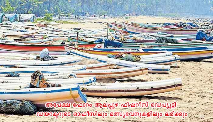 ആലപ്പുഴ: ട്രോളിംഗ് നിരോധനവുമായി ബന്ധപ്പെട്ട് ജോലി നഷ്ടപ്പെടുന്ന യന്ത്രവൽക്കൃത ബോട്ടുകളിലെ തൊഴിലാളികൾക്കും പീലിംഗ് തൊഴിലാളികൾക്കും ഹാർബറുകളിലെ അനുബന്ധത്തൊഴിലാളികൾക്കും സൗജന്യ റേഷൻ വിതരണം ചെയ്യുന്നതിന് അപേക്ഷ ക്ഷണിച്ചു. അപേക്ഷ ഫോറം ആലപ്പുഴ ഫിഷറീസ് ഡെപ്യൂട്ടി ഡയറക്ടറുടെ ഓഫീസിലും മത്സ്യഭവനുകളിലും ലഭിക്കും. അപേക്ഷ ആലപ്പുഴ ഫിഷറീസ് ഡെപ്യൂട്ടി ഡയറക്ടറുടെ ഓഫീസിലും മത്സ്യഭവനുകളിലും നൽകേണ്ട അവസാന തീയതി ജൂൺ 23.